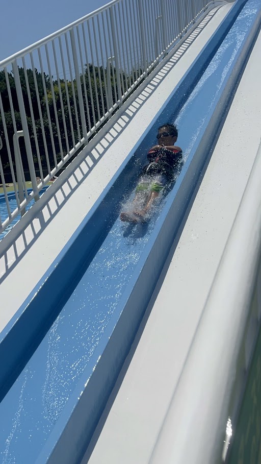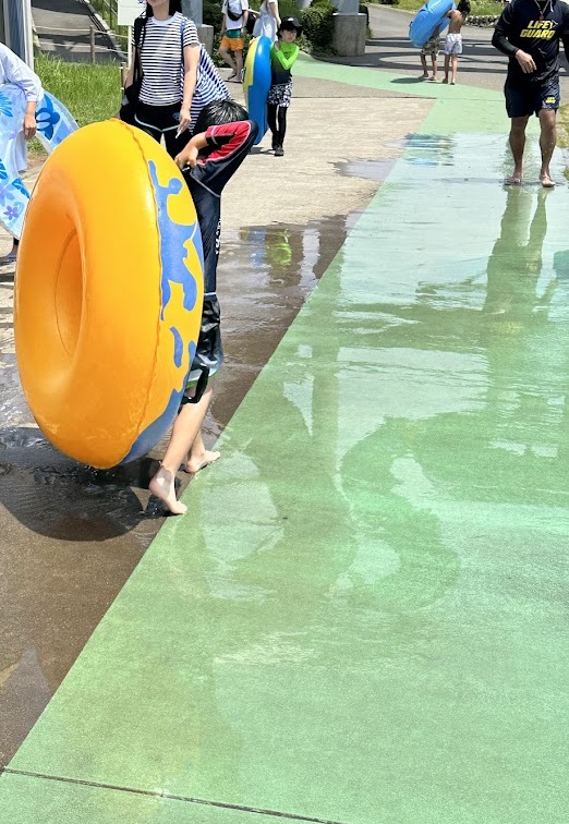 ともも、このスライダーはとても気に入ったようですが、スライダー中はビーチサンダルを脱ぐため、チューブを受け取ってから階段を登る際には、裸足で登ることになります。ここで床が熱かったのがネックで、昼ころには、1度すべるだけでいいやとなった様子。また、チューブを抱えて登るのも、120cmを超えたばかりの2年生は多少きつかったかも。