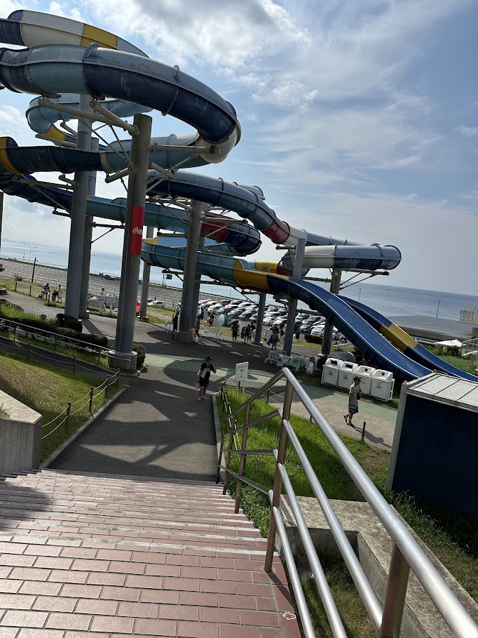 長いスライダーは、大磯ロングビーチに近く、浮き輪に座って滑ります。下で並んで浮き輪をもらってから階段を登って並ぶ仕組みです。